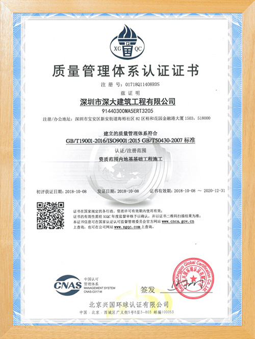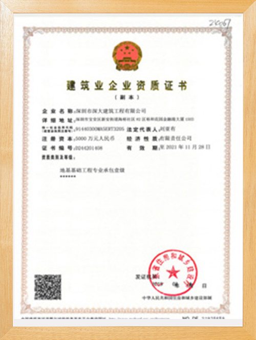 深圳市深大建筑工程有限公司,成立于2017年,注冊資本5000萬,總部位于深圳市寶安區(qū)中心地段。公司擁有地基基礎工程專業(yè)承包壹級資質,市政公用工程施工總承包二級資質,是一家一體化現(xiàn)代型企業(yè)。公司重視企業(yè)內部管理與發(fā)展,嚴格實施ISO管理體系,率先通過了ISO9001質量管理體系認證、環(huán)境管理體系及、職業(yè)健康安全管理體系的認證。為公司的長遠發(fā)展奠定了穩(wěn)健基礎。